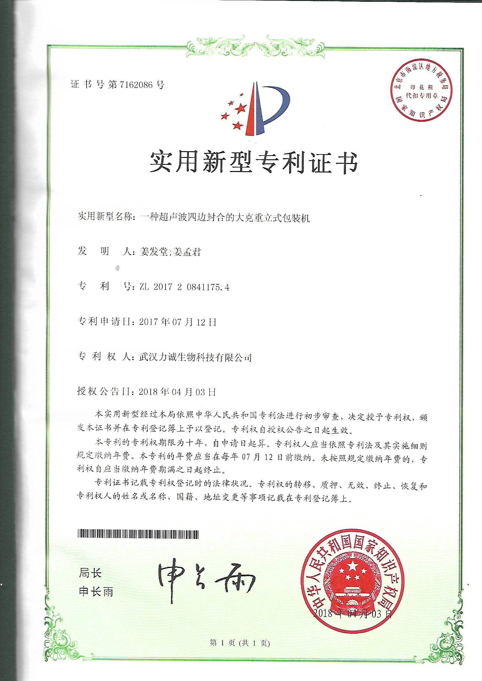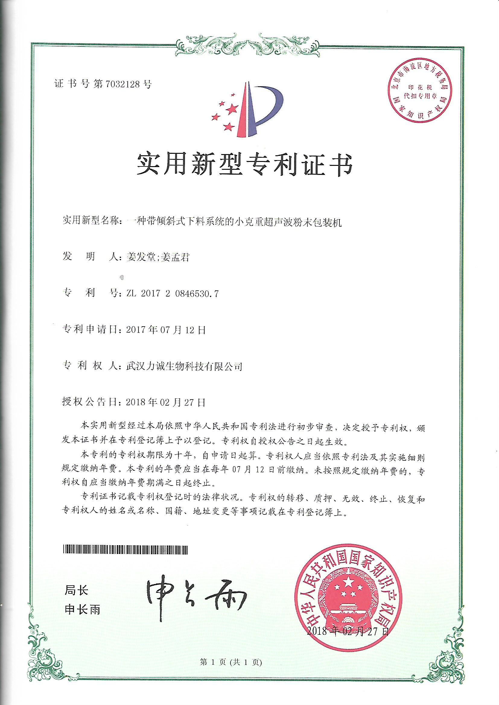 一种带倾斜式下料系统的小克重超声波粉末包装机专利证书
