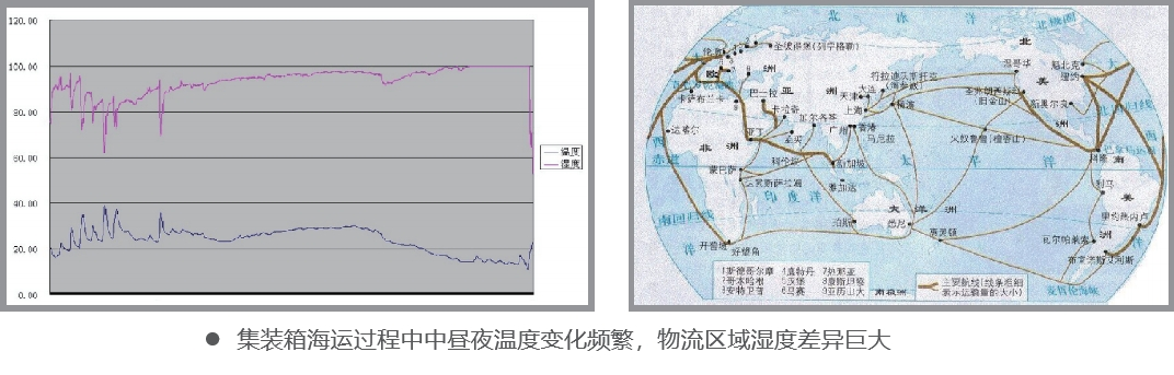 集装箱运输物流过程中的湿损发生是由于集装箱所处环境温度、湿度的明显变化引起的。如货物远距离运输中昼夜温度的变化,物流区域湿度差异等。