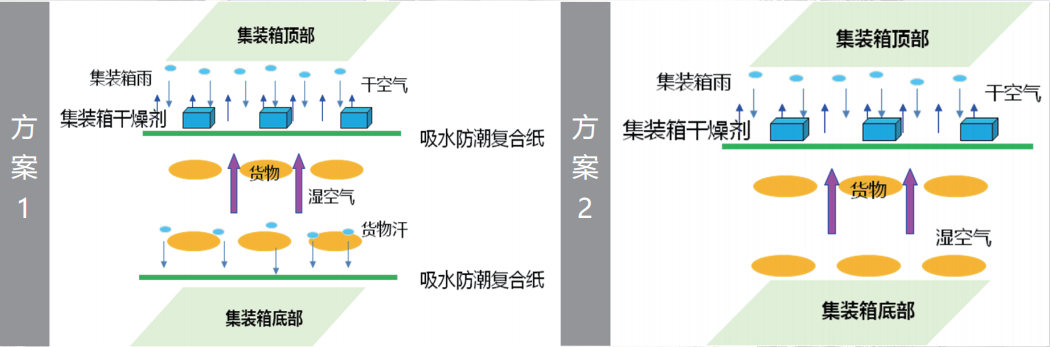 物流业或产品制造商一般采用的解决方案为20英尺的集装使用16千克的干燥剂,40英尺的集装箱使用32千克的干燥剂(在25℃、RH=80%的条件下的吸湿率为35%)。因使用干燥剂仅吸收气态水,目前该方案无法解决和避免因集装箱雾雨所导致的商品湿损。