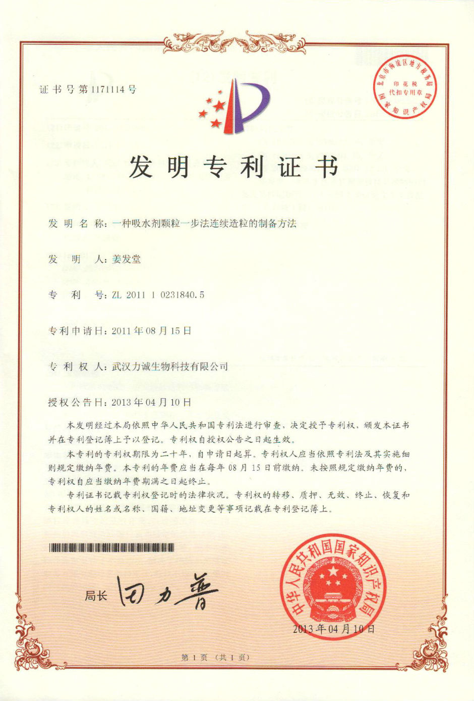 专利号:ZL  2011 1 0231840.5